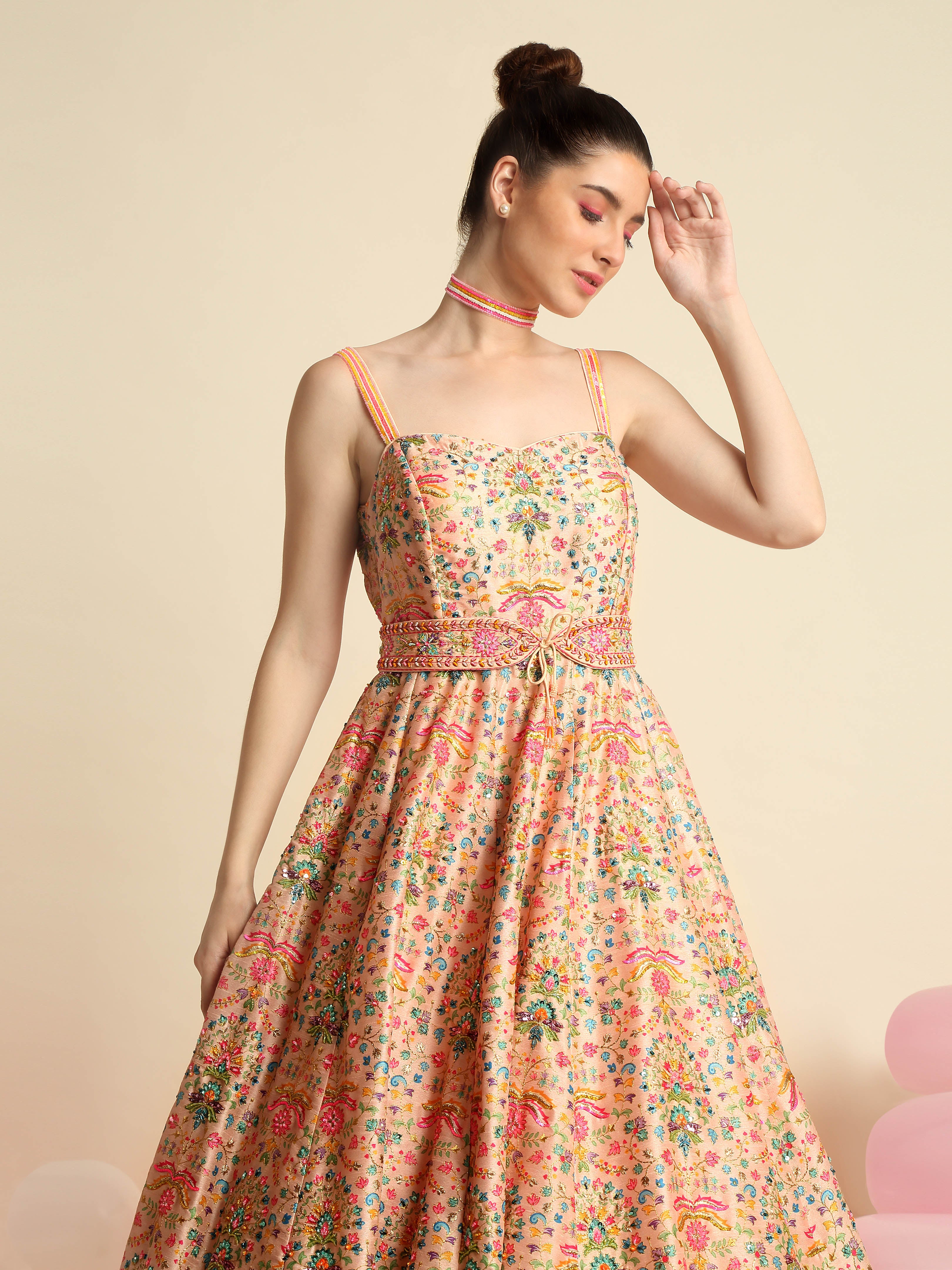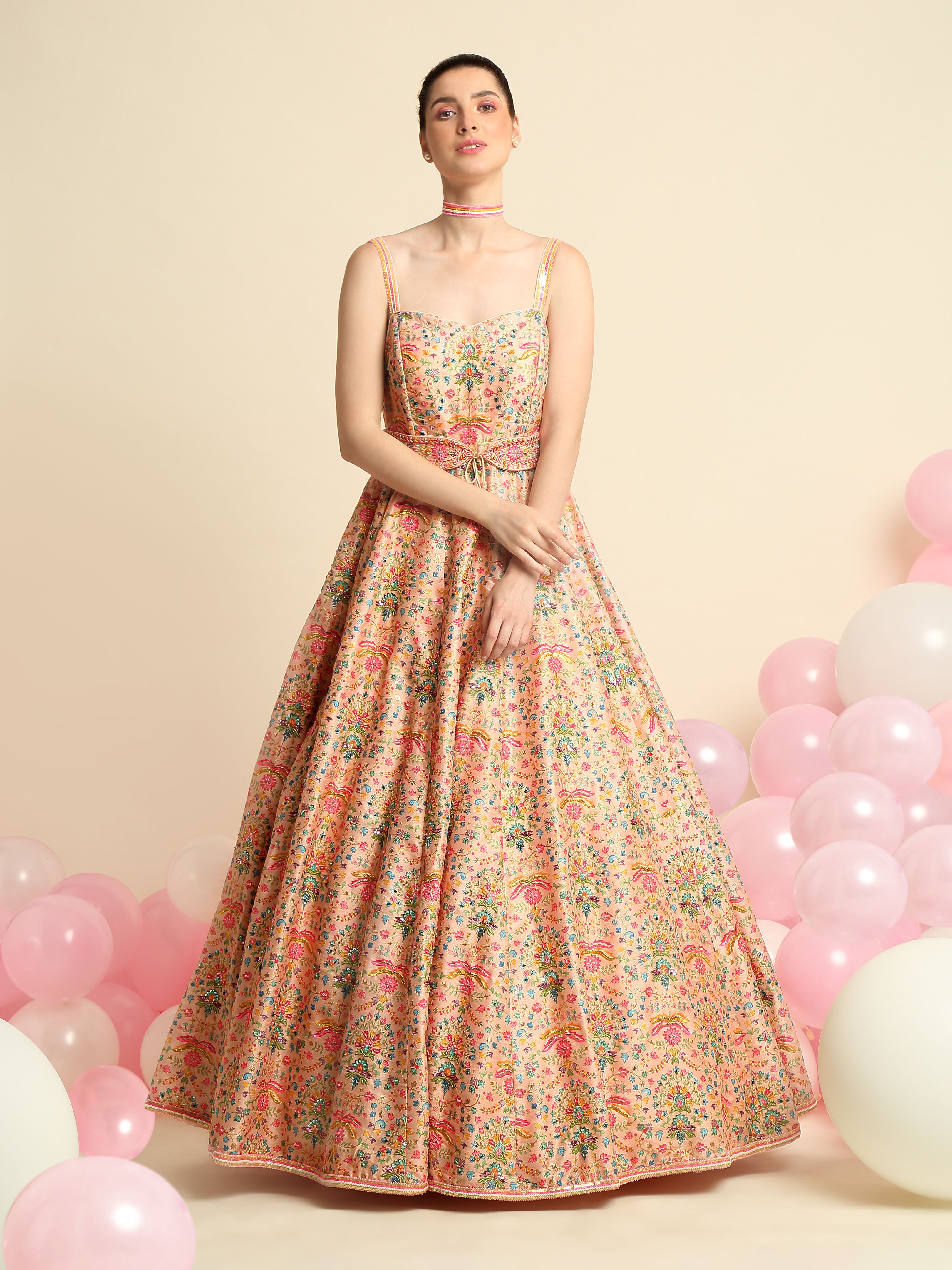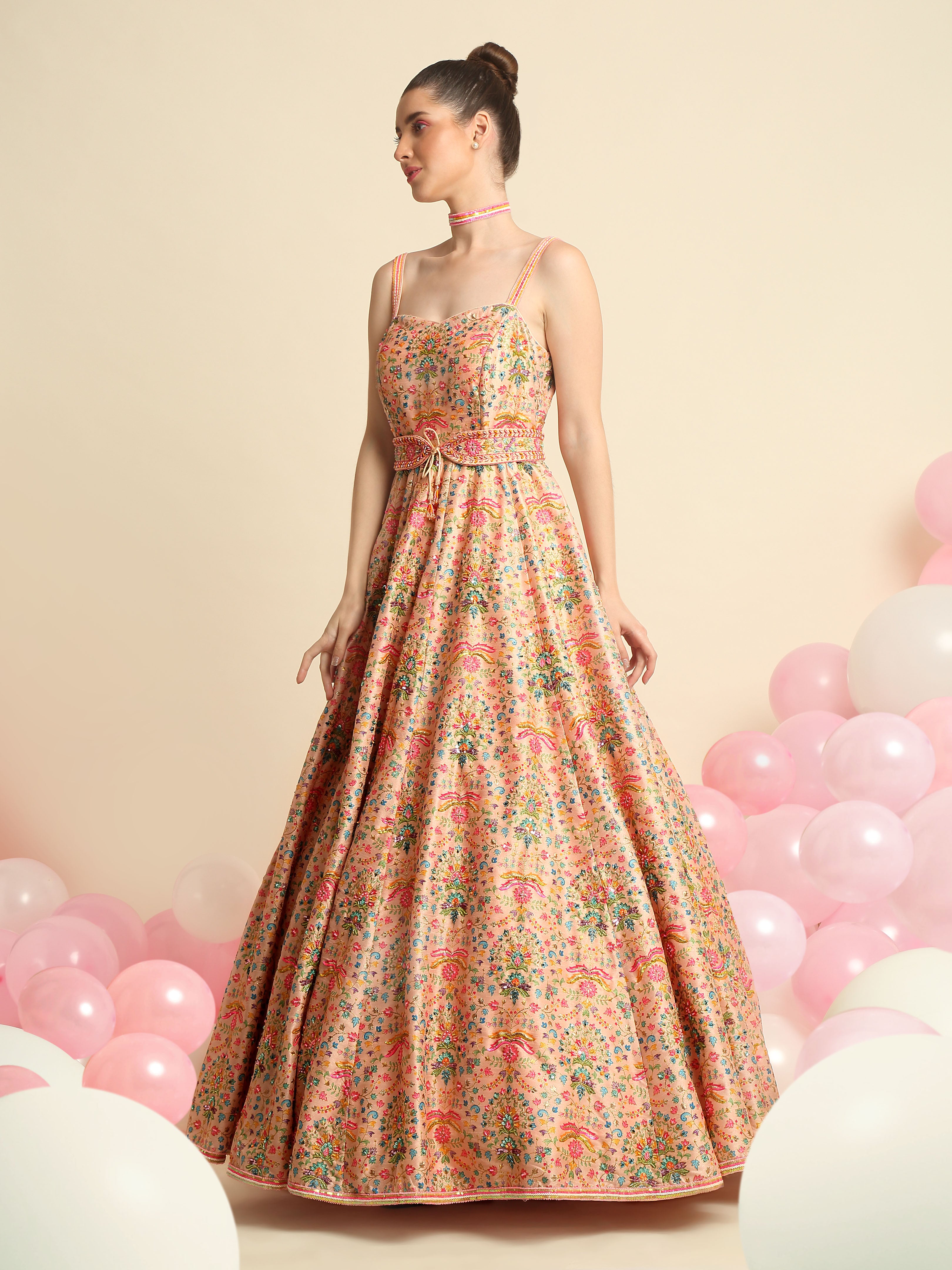 Peach Pink Printed & Embroidered Gown Peach Pink Printed & Embroidered Gown