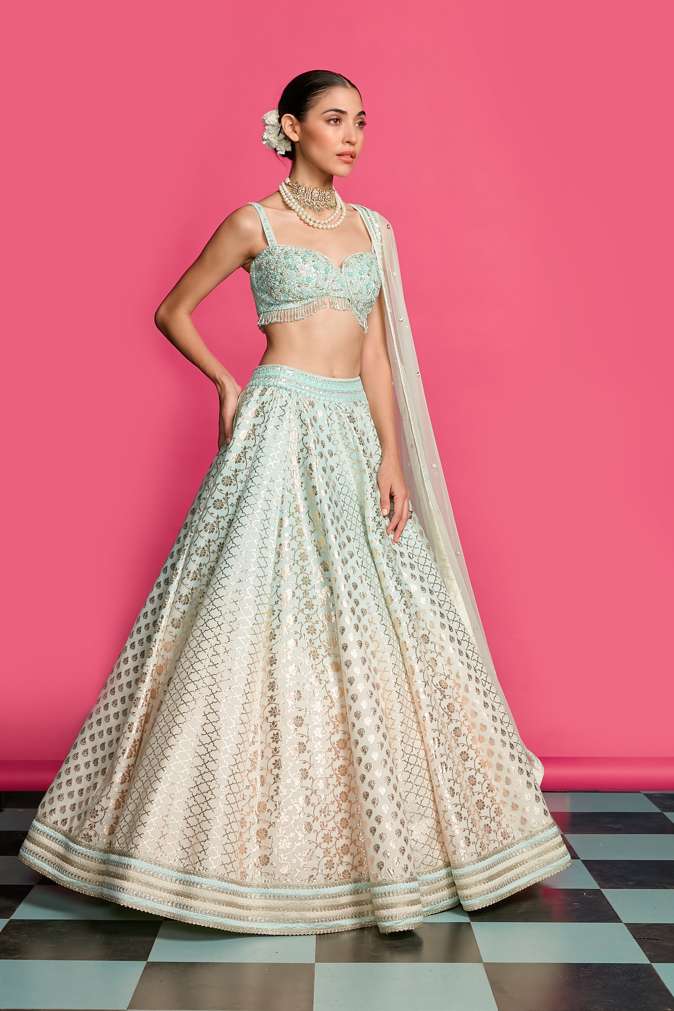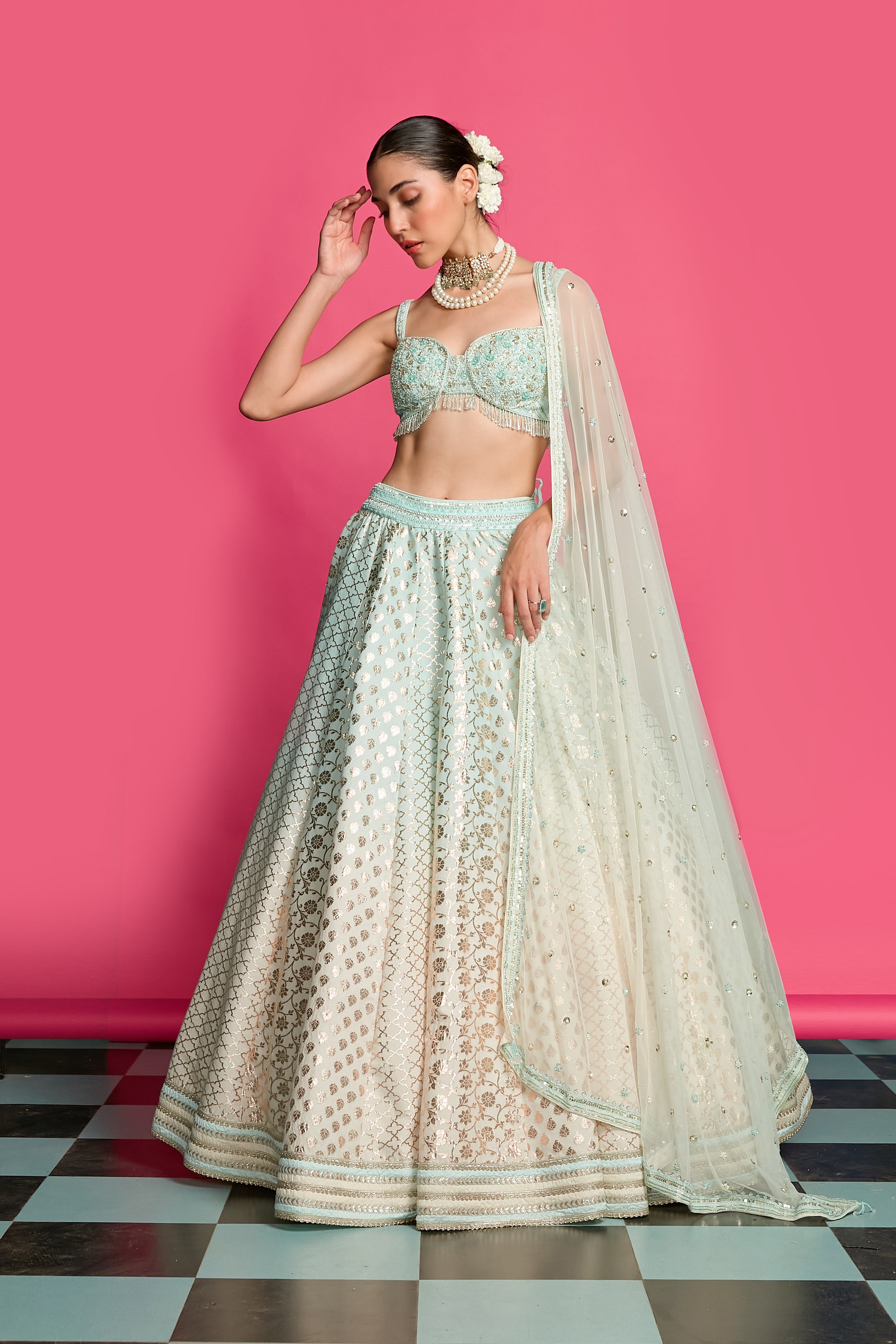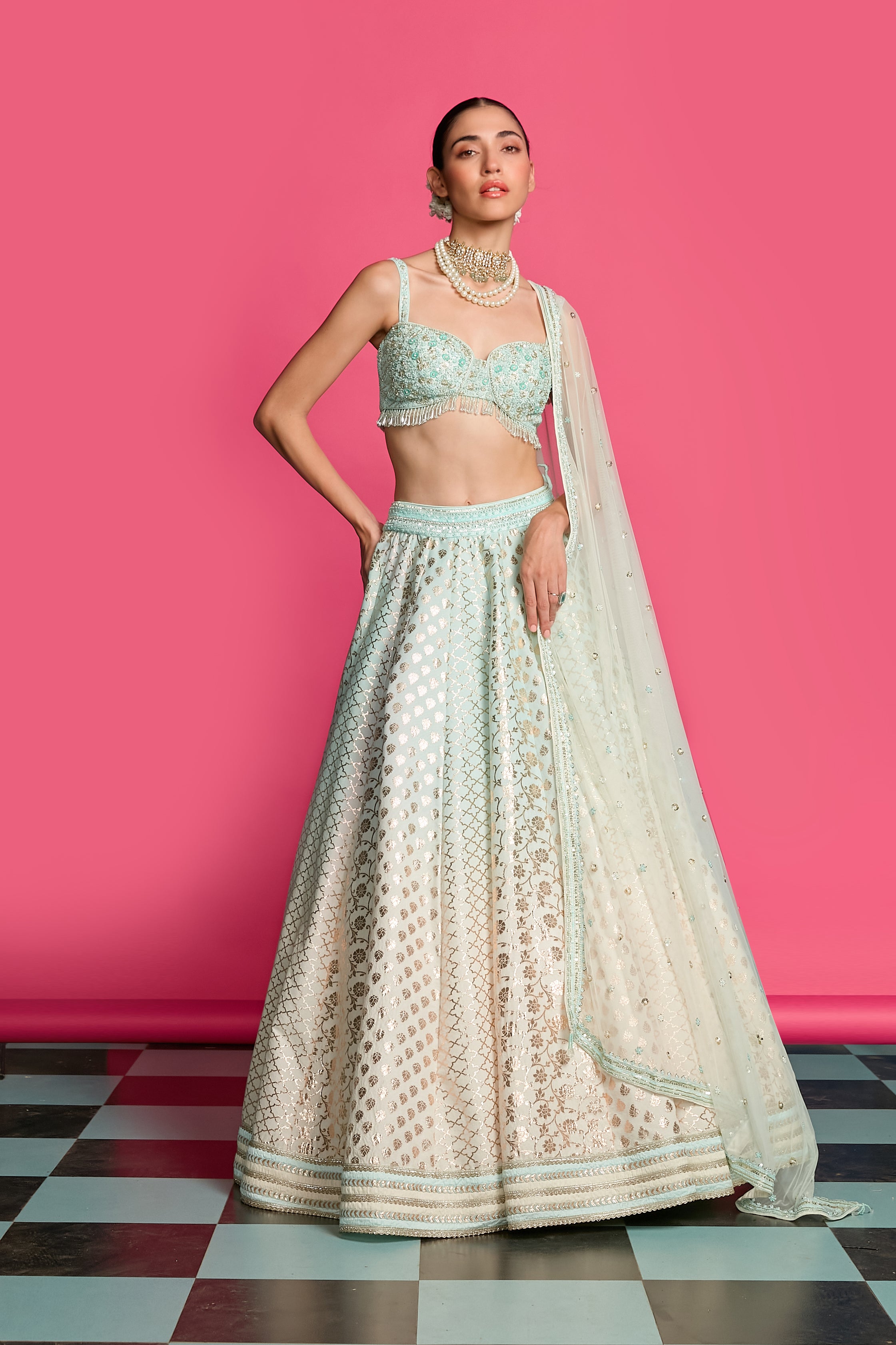 Rs. 91,600.00Sheen Green Pure Raw Silk Lehenga Set